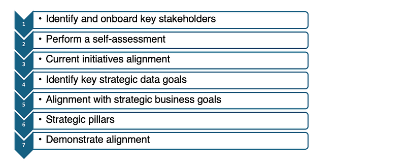 The last step would be to demonstrate how these foundational strategic data pillars would support the business vision and strategy. Do remember that the motto, data is here to help! And this demonstration should help you complete your story. While creating the strategy, always do remember that this is not a roadmap but a strategic document that aligns with the business mission and vision and will assist to achieve business goals.