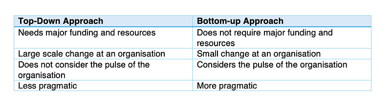 · Resistance to change: Abrupt pivot is never easy, especially when you speak about changing the culture of any organisation. When nothing works, everyone will readily accept change, however, when everything just works fine, the challenge will be to get everyone onboard who do not think anything needs to be changed. The bottom-up approach tries to mitigate this by not suggesting radical change but joining the journey that the organisation has already embarked upon. This would ensure that data will be seen as an asset and not a liability.